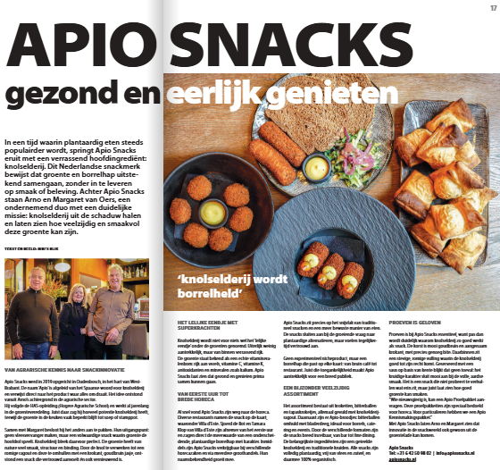 In de Primeur 1 van januari 2022 wordt het verhaal verteld van Apio Snacks en ook dat we iedereen aan de knolselderij willen hebben, en niet alleen de vegetariërs.